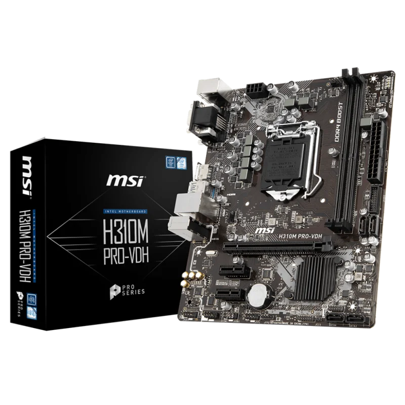 The H310M Pro-VDH LGA 1151 Micro-ATX Motherboard from MSI is built on the Intel H310 chipset with an LGA 1151 socket for 9th / 8th generation Intel Core, Pentium Gold, and Celeron processors. Two DDR4 memory slots support a max of 32GB of 2666 MHz RAM and four SATA III ports for storage drives. Graphics can be handled by your CPU’s integrated graphics processor, or by a dedicated graphics card for more power via the PCIe 3.0 x16 slot. Other integrated features include Realtek Gigabit LAN, VGA, DVI-D, and HDMI outputs, and Realtek ALC887 7.1-channel high-definition audio.